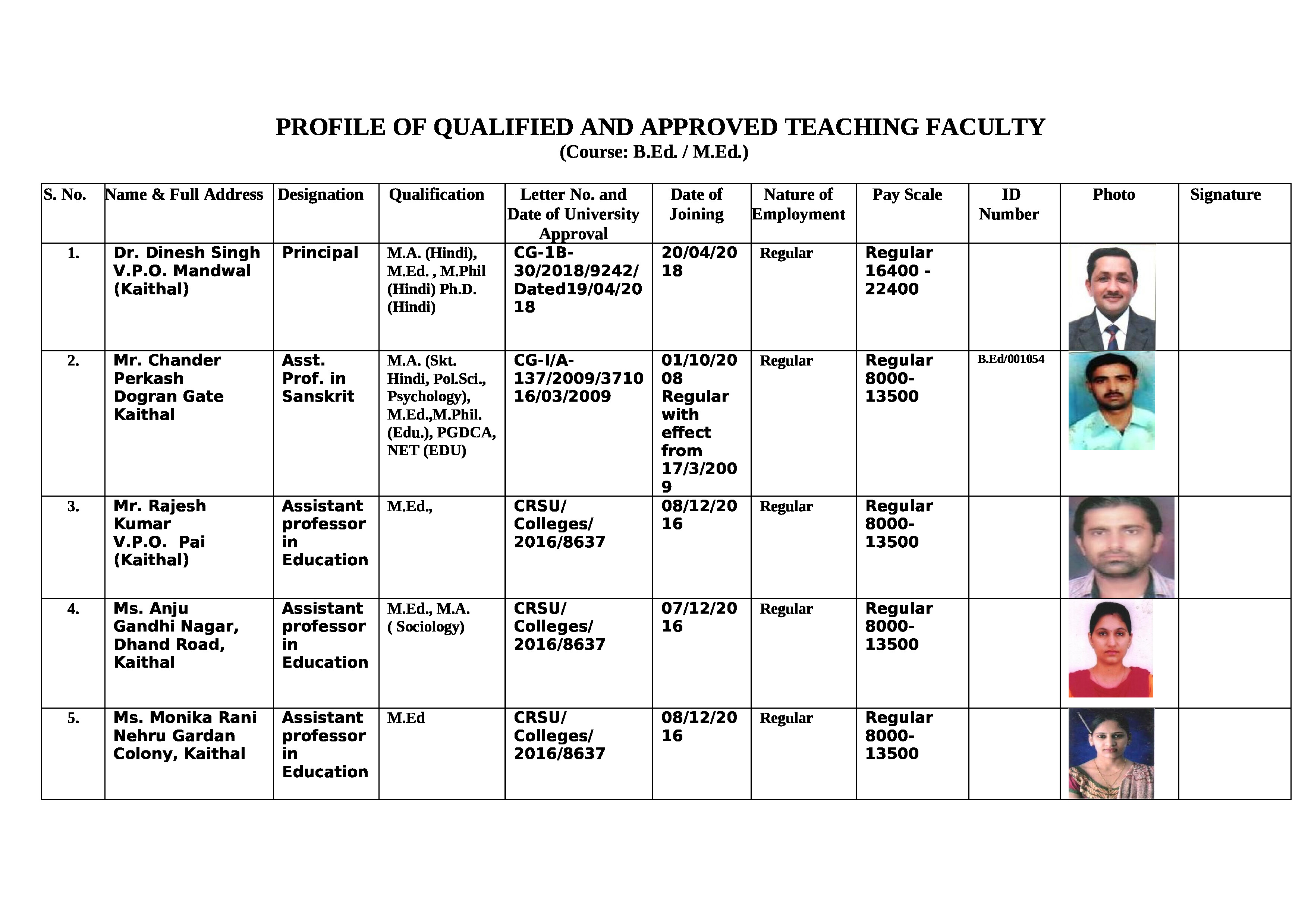 | Sh. Rajesh Kumar | Assistant Professor | 08/12/2016 | 16400/- -39100/- | Education | M.Ed., | ![]() |